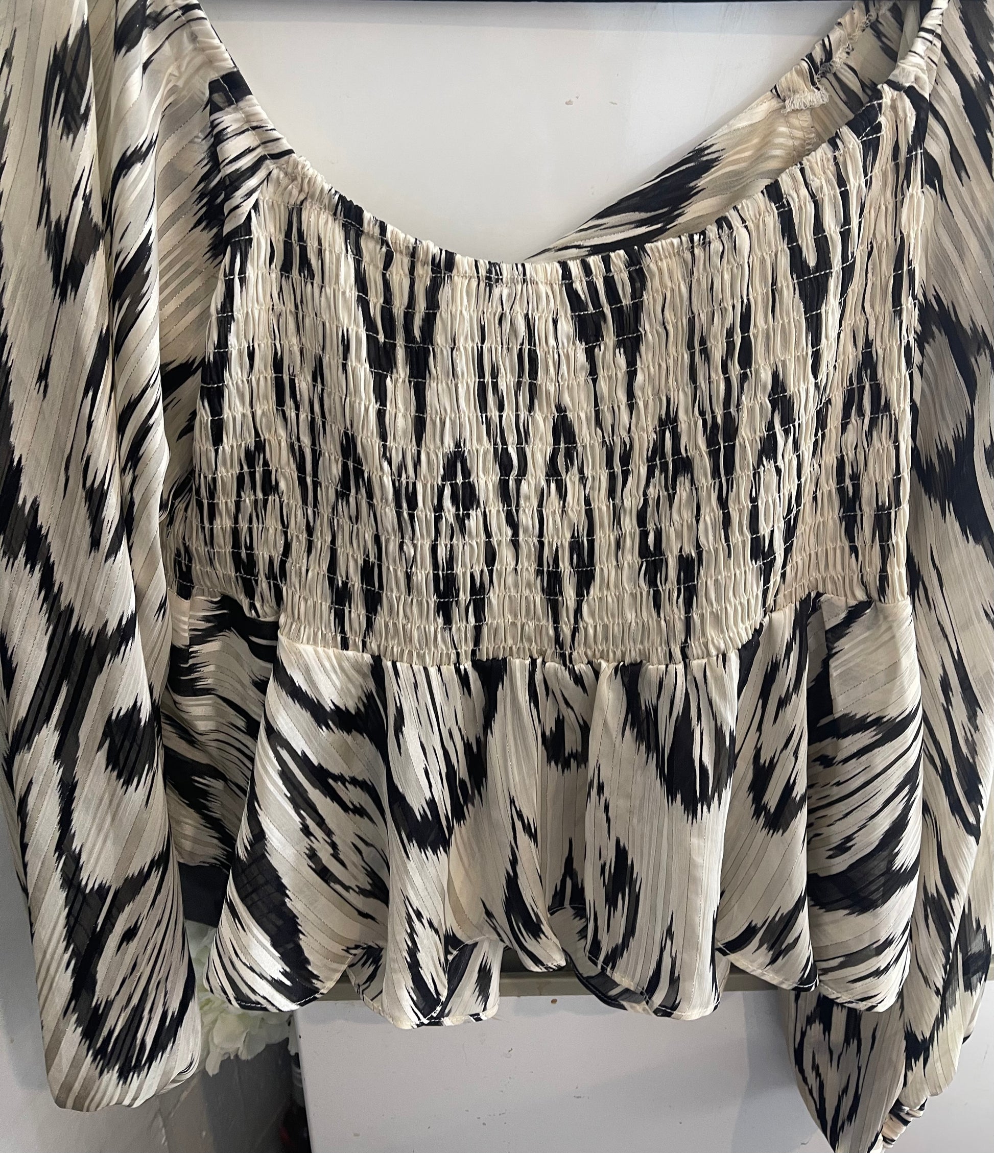 Gorgeous wee black and cream piece with a subtle silver sparkle running through the fabric. Such a lovely little style that can easily be worn across all seasons. Dress it up or keep it casual — a very versatile wardrobe piece. In excellent, near-new condition and true to size. ✨