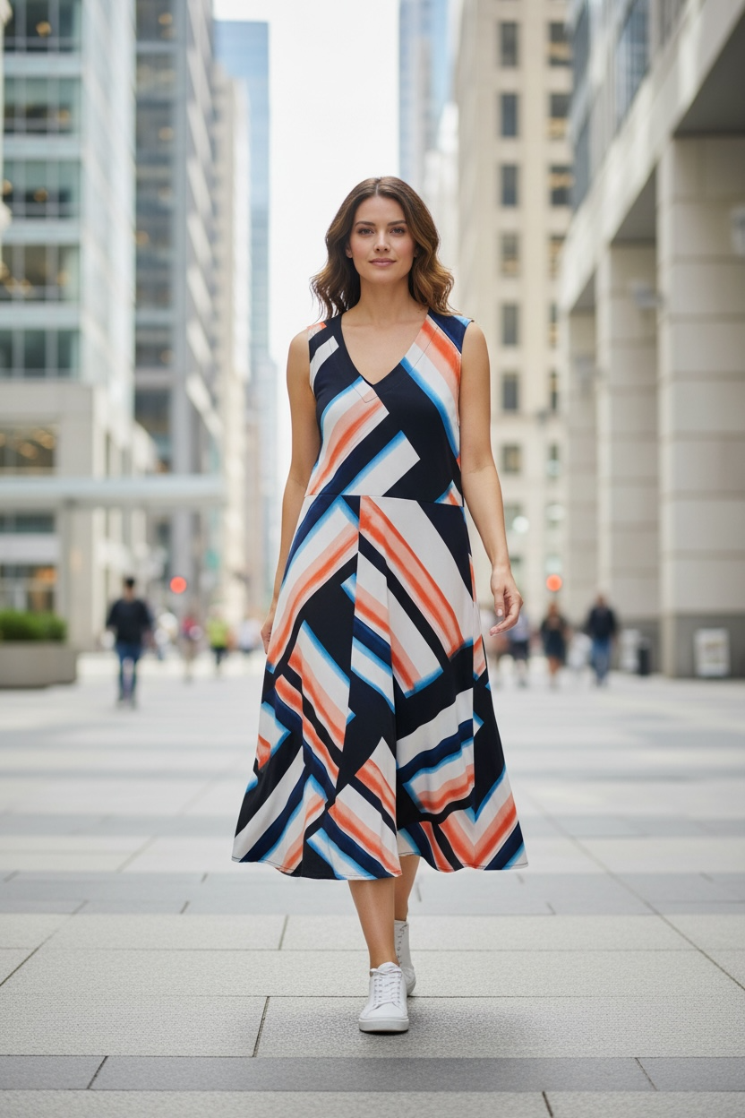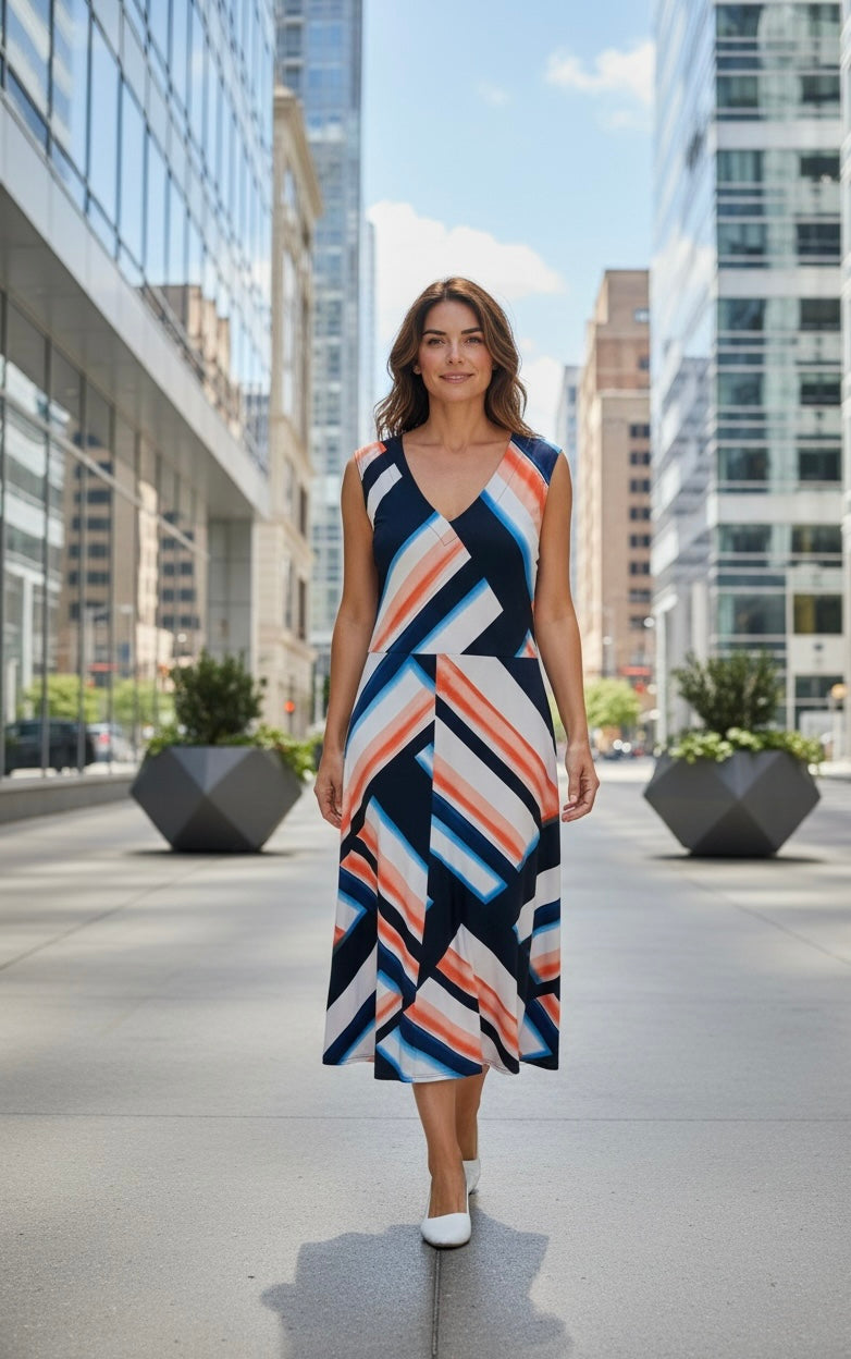 Beautiful multi-coloured designer dress with an elegant, chic feel. Fully lined and made from a comfortable polyester/spandex blend that has a lovely stretch and drape. A timeless piece that works just as well for special occasions as dressed down with boots or a blazer. Brand new with tags.