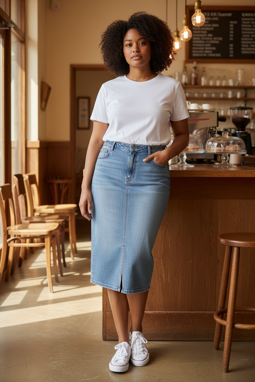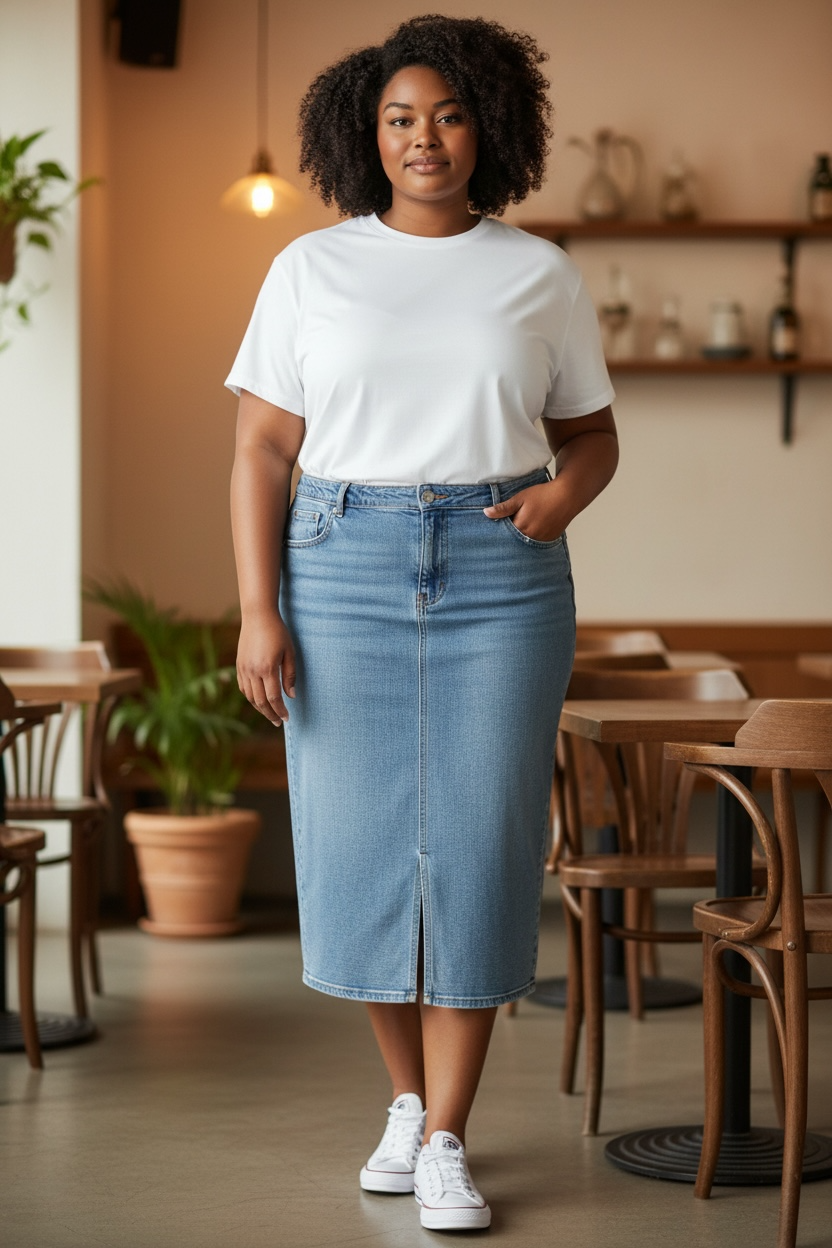 A gorgeous designer vintage-style denim skirt in a beautiful classic wash. Featuring a flattering wee front split, front and back pockets, and crafted from thick, quality denim with just the right amount of stretch. Such a great everyday wardrobe staple – easy to dress up with a blazer or keep casual with sneakers. New condition and ready to wear.